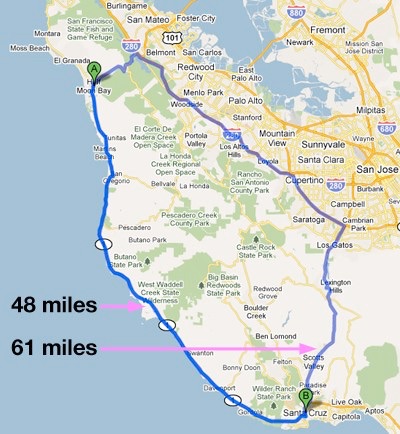 While sitting in lovely although perpetually foggy Half Moon Bay, CA, I asked the GPS for the most direct route to Santa Cruz. Now the obvious answer is 48 miles straight ahead on the most beautiful stretch of Highway 1. Instead the GPS insisted that the best route was a 61-mile route detouring into congested Silicon Valley and traversing three different highways. Dashboard bonehead!